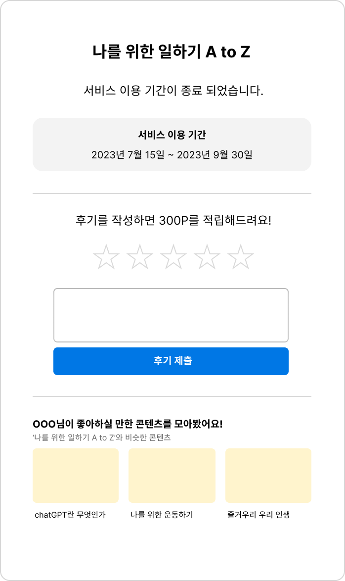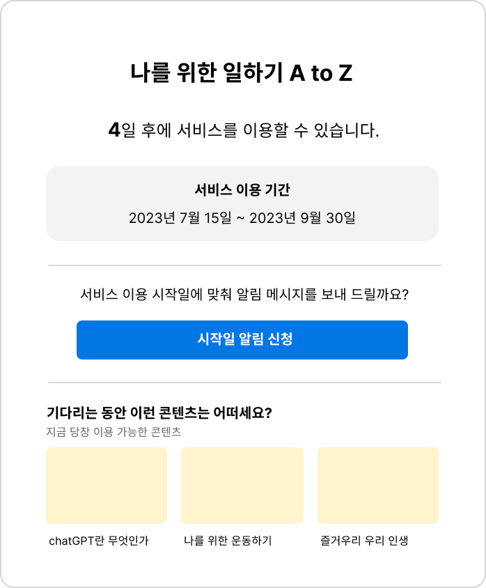 여기에 적절한 아이콘이나 이미지 등 디자인 요소들이 더 추가된다면 이용기간 이전에는 사용자의 기대감을 높이고, 이후에는 리텐션을 유도하는 매끄러운 경험을 완성할 수 있습니다.