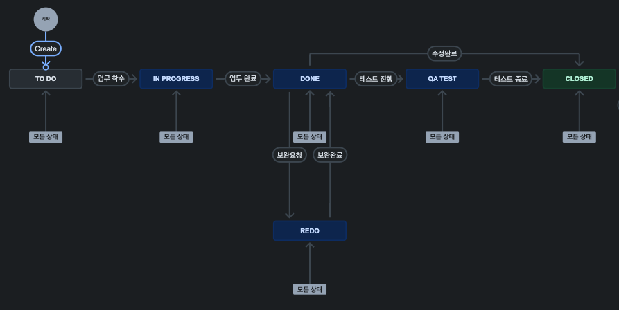 위의 그림과 같이 하나의 티켓이 생성되었을 때, 업무에 착수했을 때, 완료되었을 때 등등 '진행 현황에 따라 티켓 상태는 이렇게 업데이트 하자!'로 서로 약속하는 부분이라고 보시면 되겠습니다.