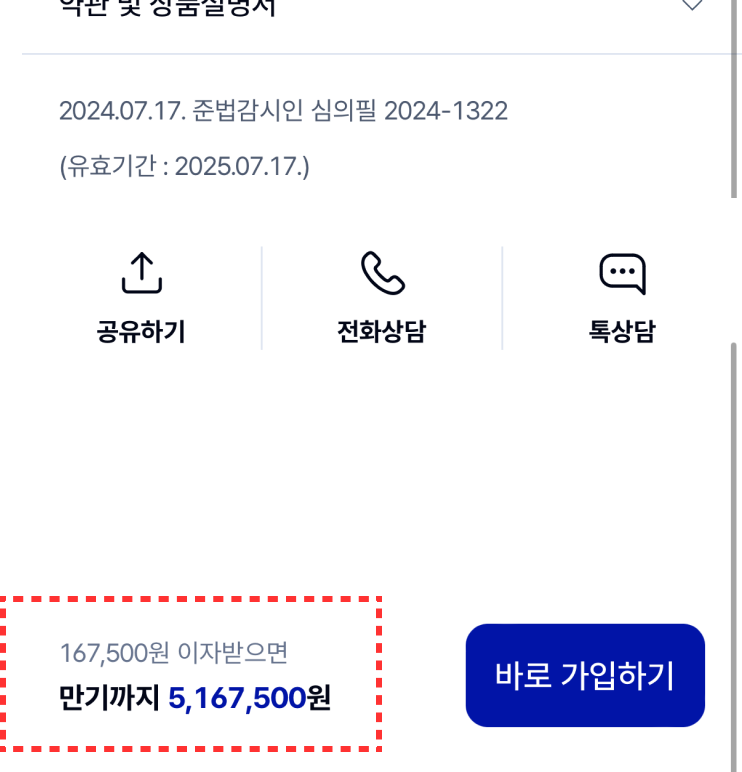 ![]() | 가입하기 버튼 옆에 만기 금액을 노출하여 고객이 받을 혜택을 강조하는 점이 돋보임 |