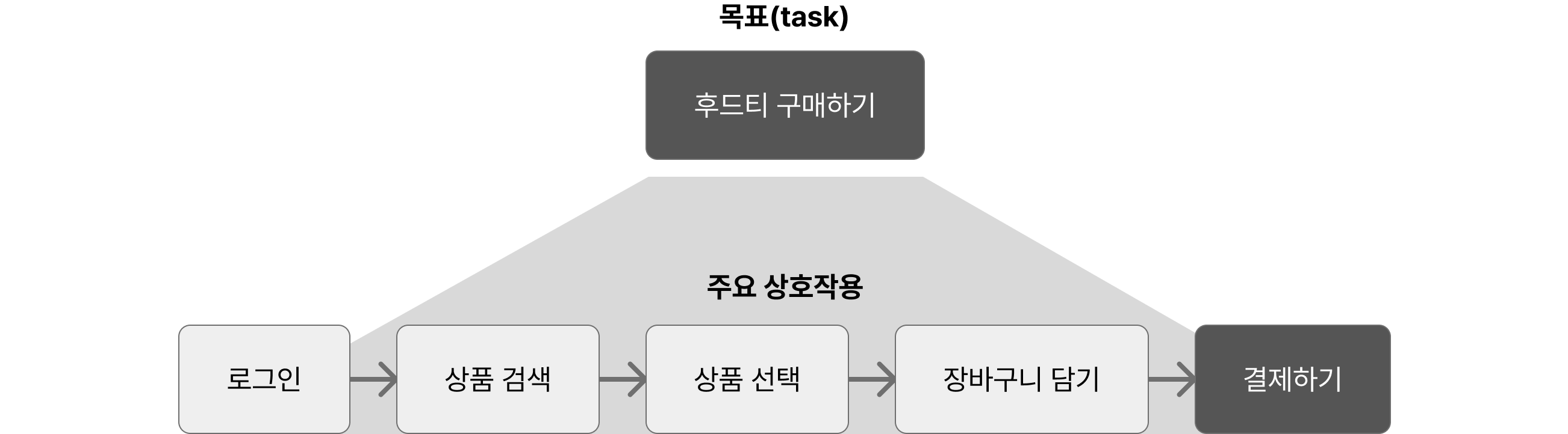 우리 쇼핑몰에서 ‘후드티 구매’라는 목적을 달성하기 위해 필요한 단계는 무엇일까요?