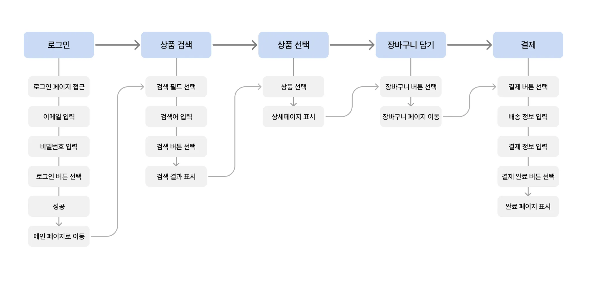 | 로그인 | 상품 검색 | 상품 선택 | 장바구니 담기 | 결제하기 |