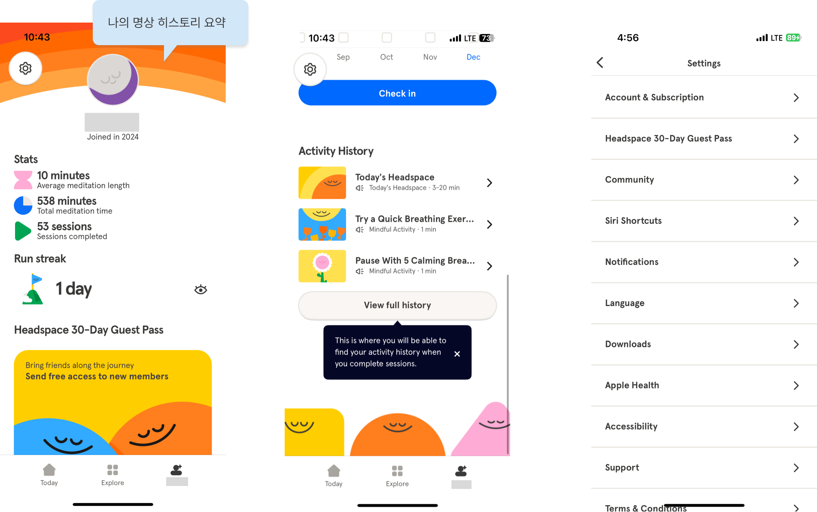 헤드스페이스는 Today, Explore, My Page라는 3개의 탭으로 비교적 간단하게 구성되어 있습니다. 각 탭 안에는 명상 콘텐츠들이 네이밍에 맞게 배치되어 있습니다.