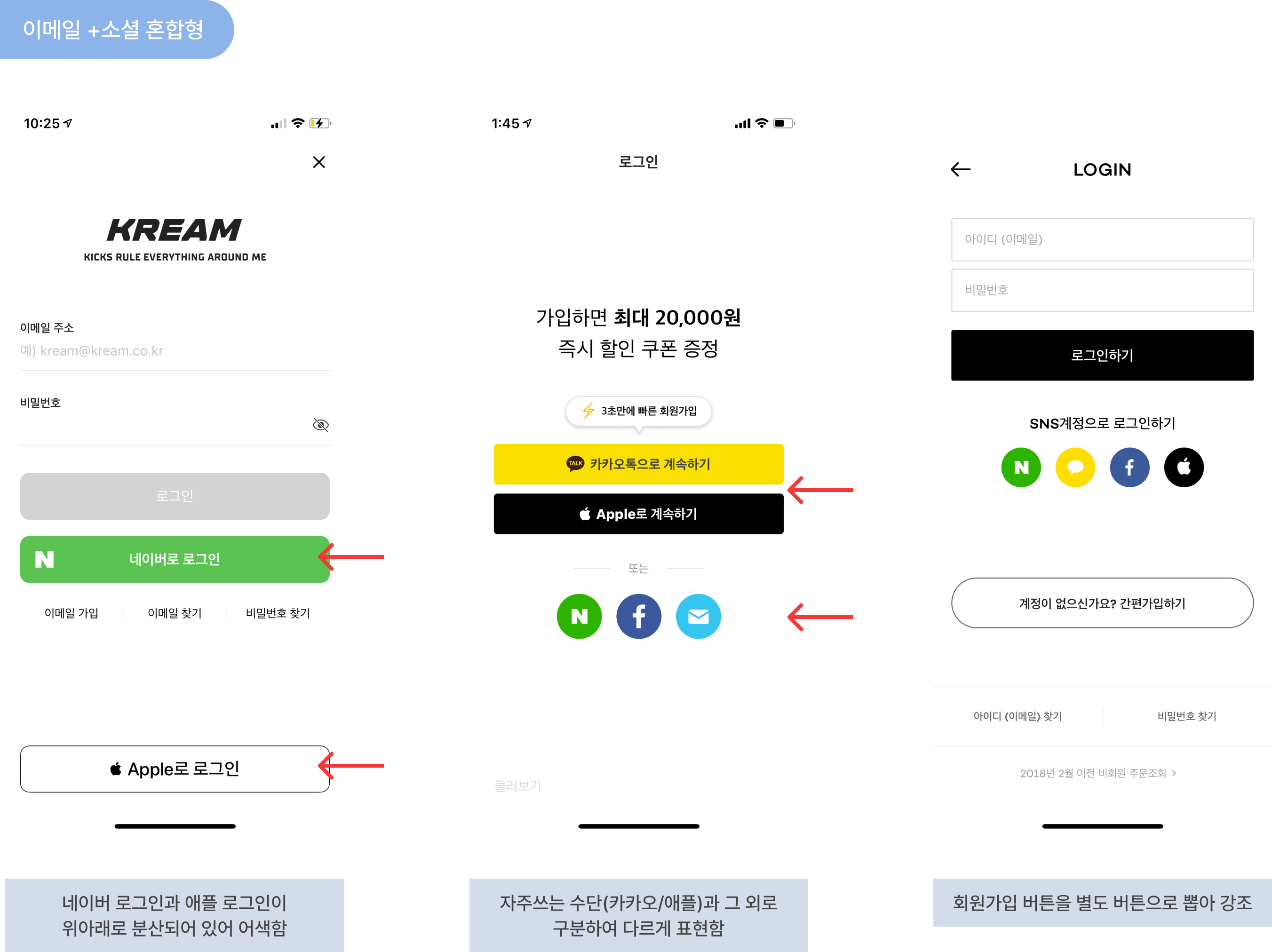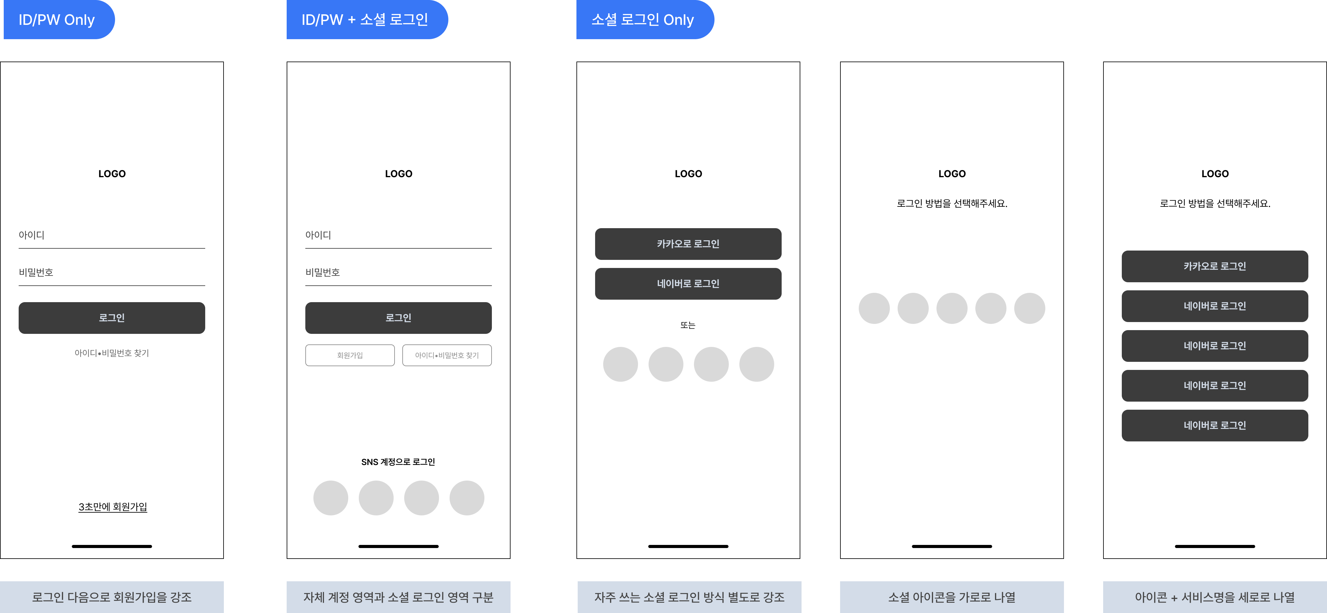 이 레퍼런스들을 살펴보니 공통적인 패턴이 발견되는데요, ID/PW 입력 방식과 소셜 로그인 방식 두 가지가 단독 또는 혼합되어 사용되고 있다는 것입니다.