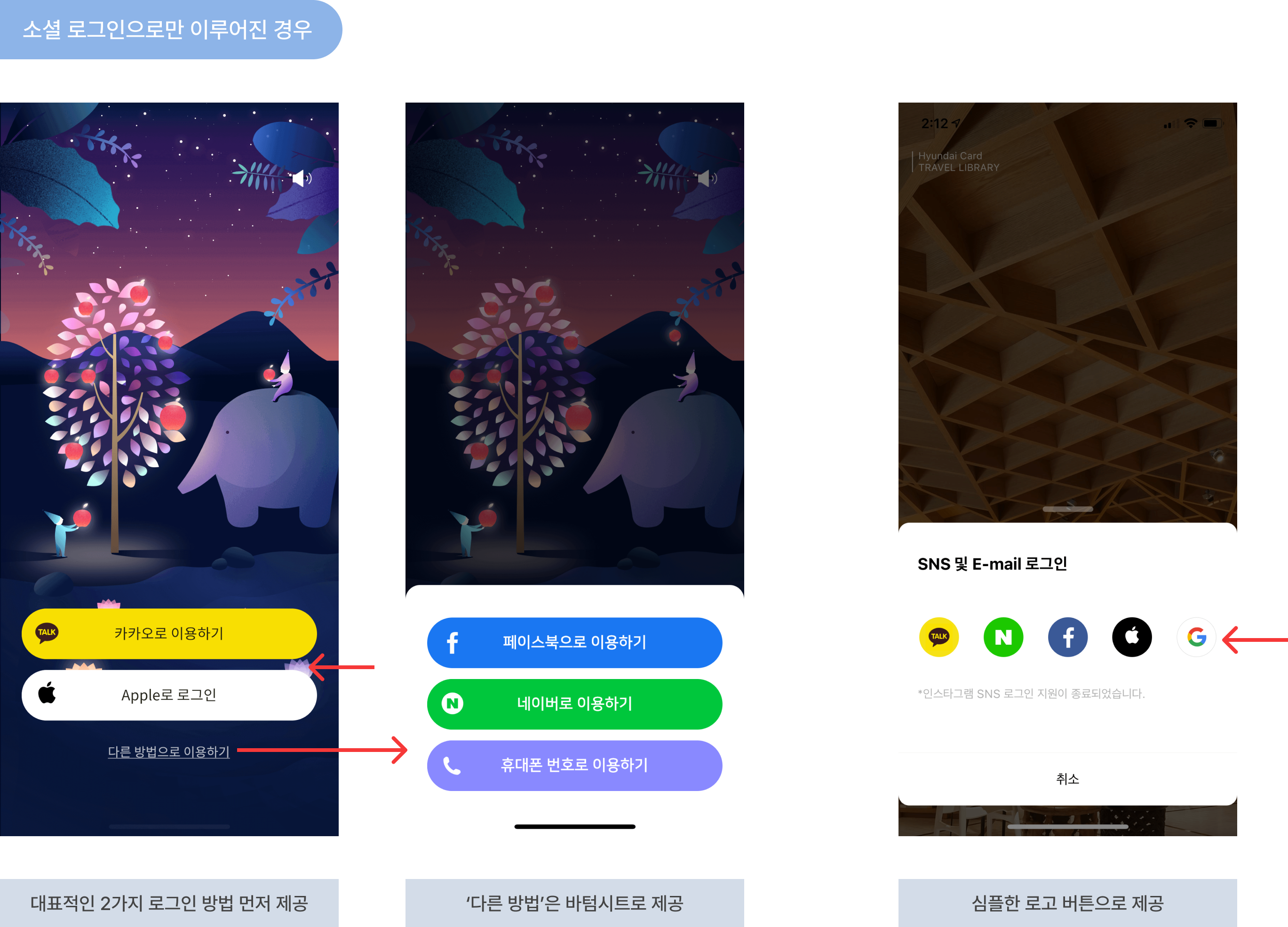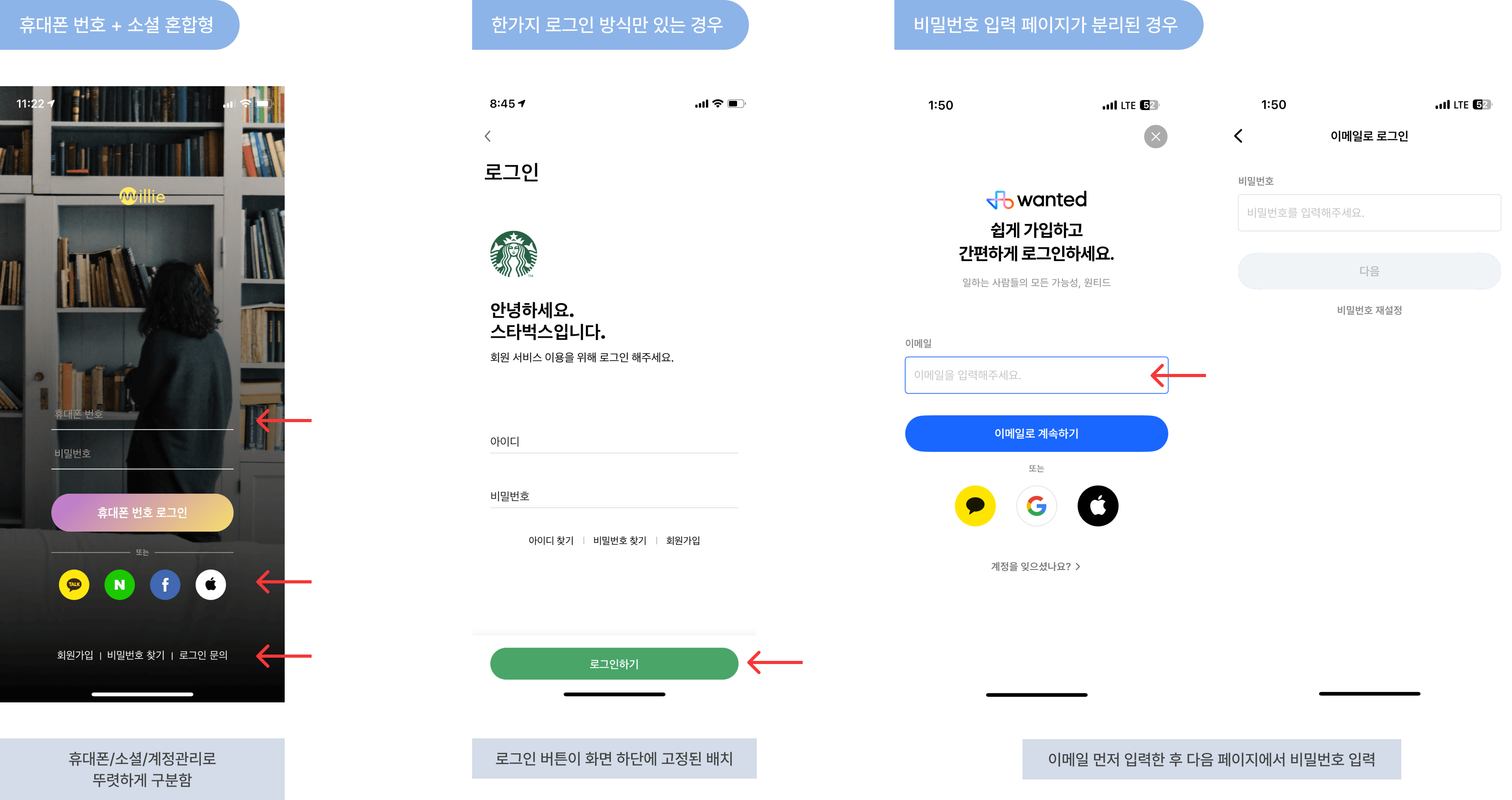 이런 요소들이 조합되어 아래의 예시와 같이 다양한 패턴의 로그인 화면을 만들어냅니다.