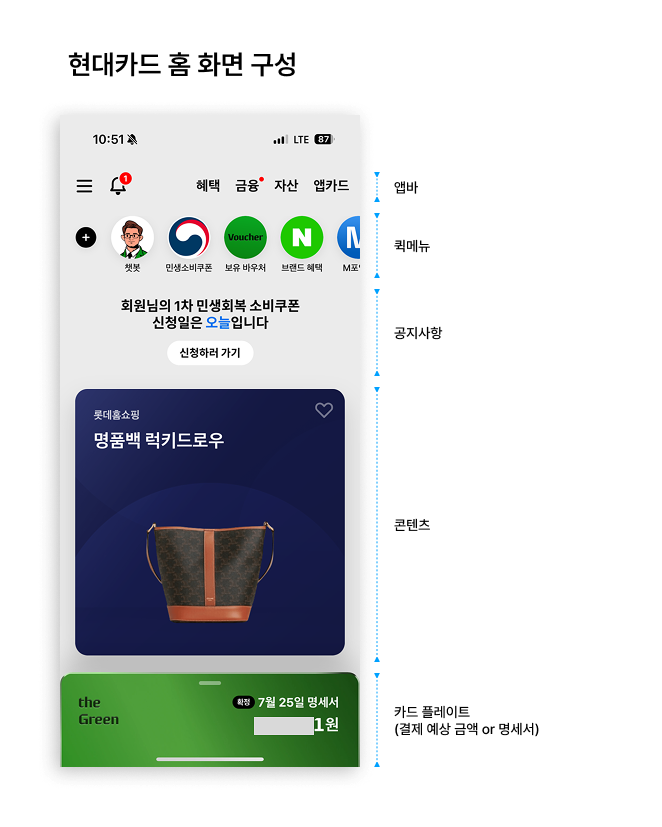 현대카드 앱의 콘텐츠 영역은 세로 스크롤 인터랙션을 기반으로 카드형 콘텐츠와 가로형 캐러셀이 조합된 하이브리드 구조로 설계되어 있습니다. 덕분에 사용자는 단조롭지 않게 다양한 정보를 탐색할 수 있습니다.