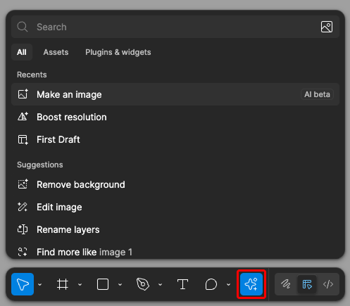 Figma를 실행한 뒤 작업 화면 하단의 도구 모음에서 별 모양 아이콘을 클릭하면 새로운 AI 기능들을 한눈에 확인할 수 있습니다.