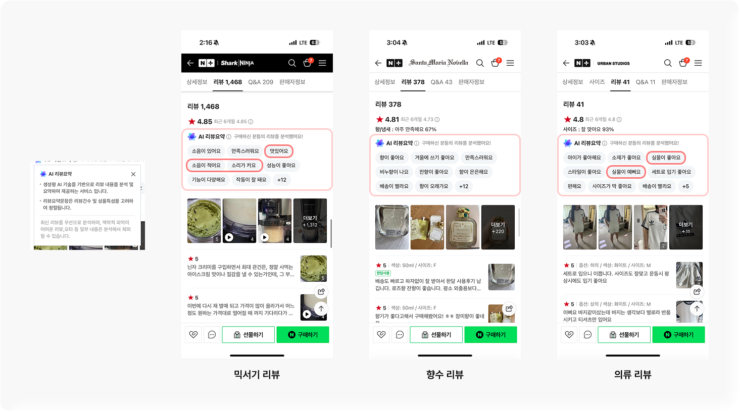 예를 들어, 믹서기 상품 페이지에서는 ‘소음이 적어요’, ‘성능이 좋아요’, ‘작동이 잘 돼요’와 같은 긍정적인 키워드가 추출되어 표시되고, 향수나 의류 제품에서도 제품 특성을 반영한 요약이 제공됩니다.